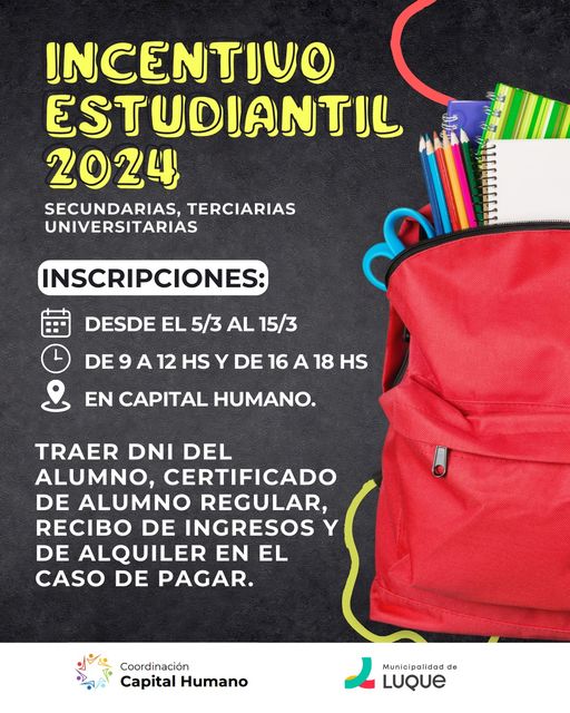 El martes 5 de marzo se abren las inscripciones para el Incentivo estudiantil 2024, la ayuda económica que otorga la Municipalidad de Luque a estudiantes de secundaria, universidad y estudios terciarios.