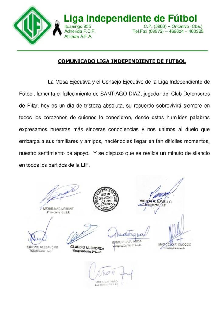 La Liga Independiente de Fútbol también se expresó sobre la muerte del joven y expresó en un comunicado que este domingo habrá un minuto de silencio en todos los partidos.