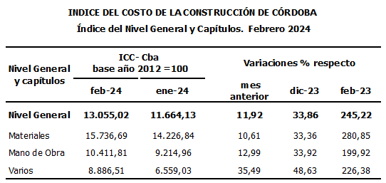 Durante el mes de febrero de 2024, el Índice del Costo de la Construcción de Córdoba (ICC- Cba) registró una variación mensual del 11,92% en su Nivel General y del 245,22% en relación a febrero de 2023.