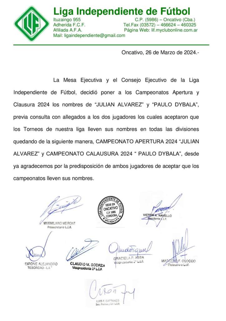 La Liga Independiente de fútbol con sede en la localidad de Oncativo, emitió un comunicado donde informa que el torneo apertura 2024 llevará e nombre de Julián Álvarez en homenaje a calchinense campeón de mundo y que el torneo clausura se llamará «Paulo Dybala» en honor a ídolo mundialista oriundo de Laguna Larga. El comunicado expresa también que la decisión fue consultada a los allegados de ambos jugadores quienes prestaron el consentimiento para que sus nombres pudieran ser utlizados para nombrar ambos torneos.