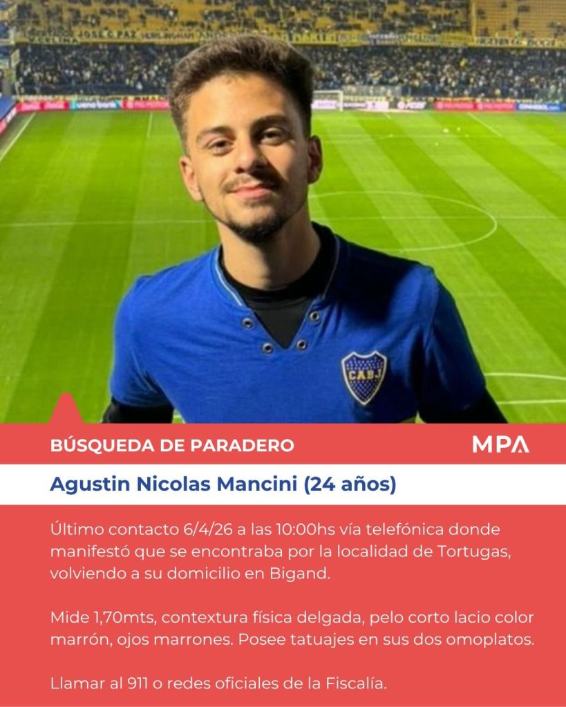 La policía y la familia de Agustín Nicolás Mancini, un joven de 23 años oriundo de Bigand, intensifican la búsqueda tras perder todo contacto con él durante la mañana de este lunes, luego de que se dirigiera por trabajo hacia la provincia de Córdoba.